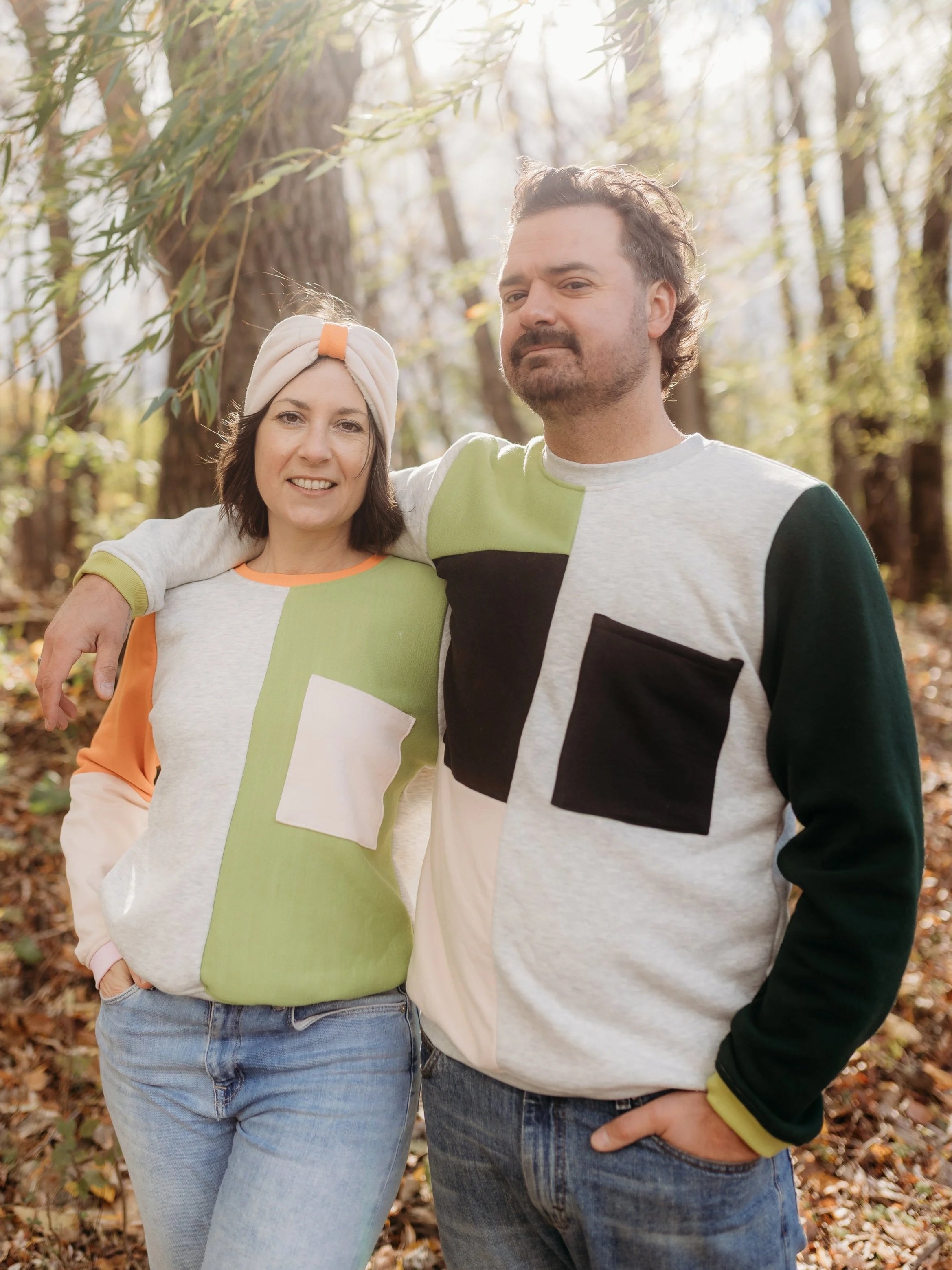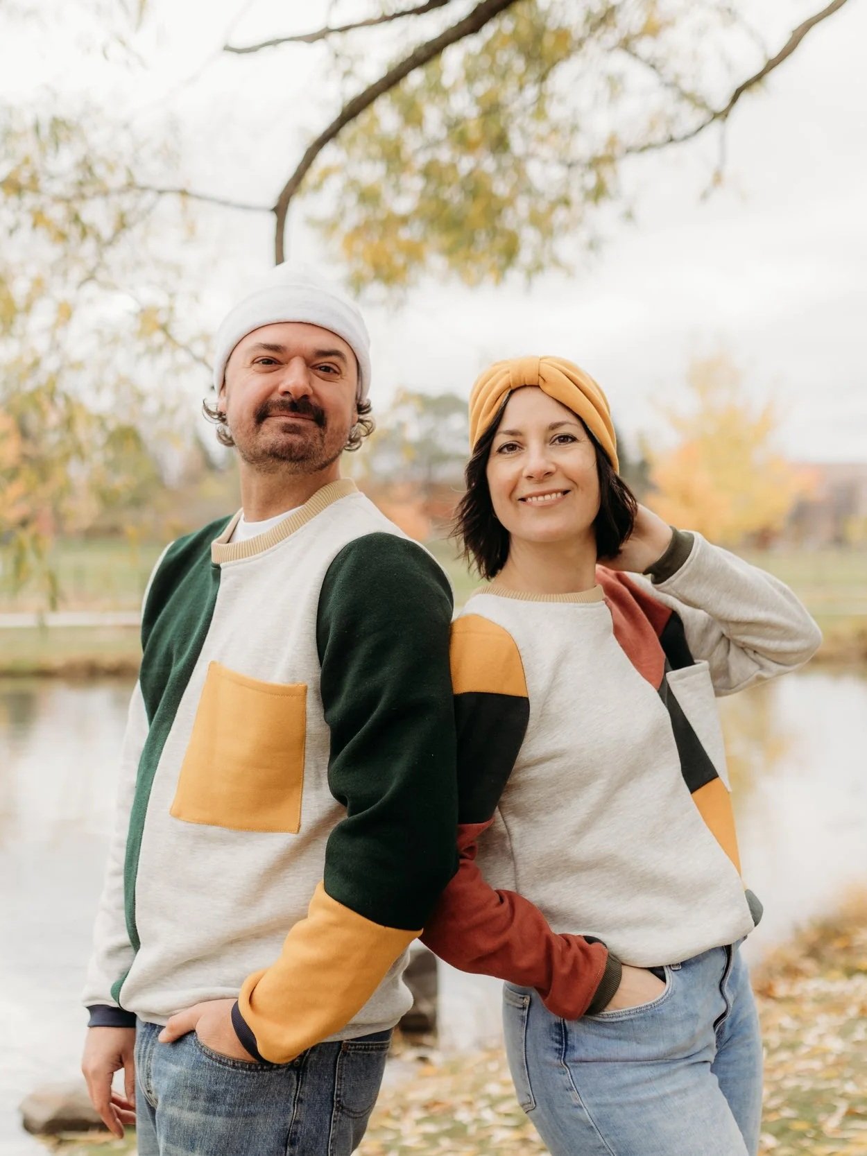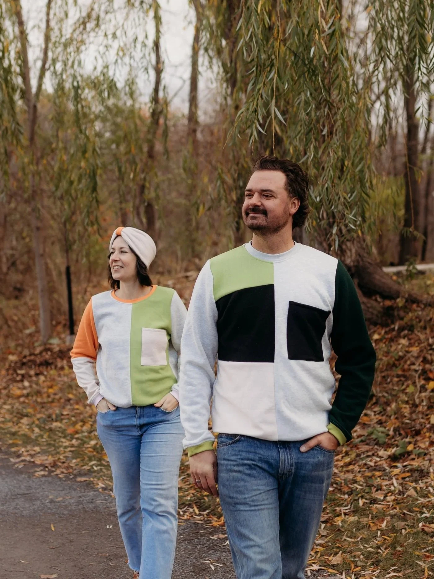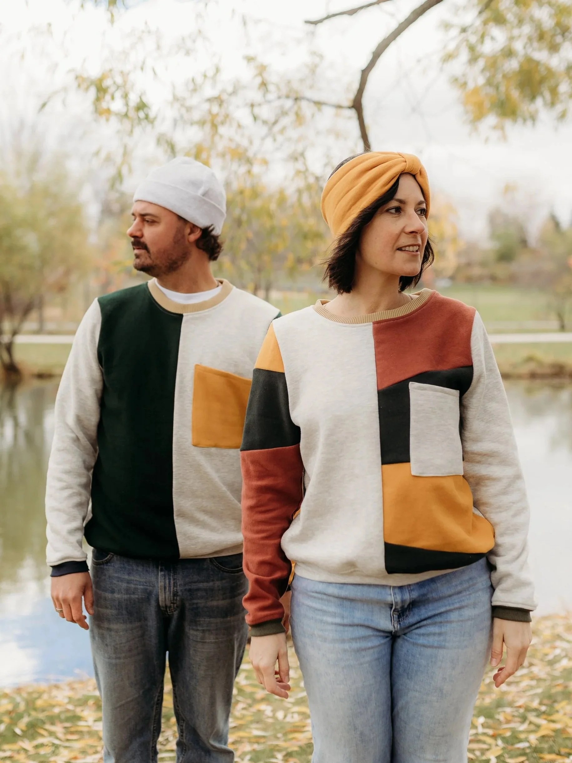 Notre haut à poche change de couleur au rythme des tissus à récupérer. En ce moment, les couleurs disponibles sont le crème (femmes), le gris chiné clair et le gris charcoal.
